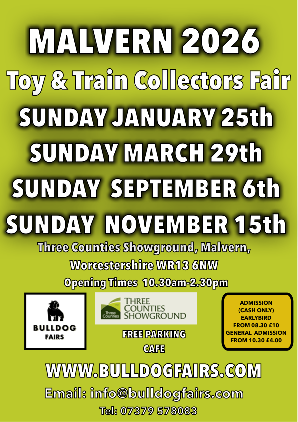 We are running this Fair in the Severn Hall with a capacity of 250 stalls. There will be a diverse range of toys and models for sale from some of the best dealers from around the UK. Model Railway: HORNBY, BASSETT LOWKE, LIMA, scalextric, N GAUGE, O GAUGE, All the major manufacturers. Diecast: DINKY, CORGI, EFE, LLEDO, OXFORD, SPOT ON, TEKNO, WSI and corgi trucks